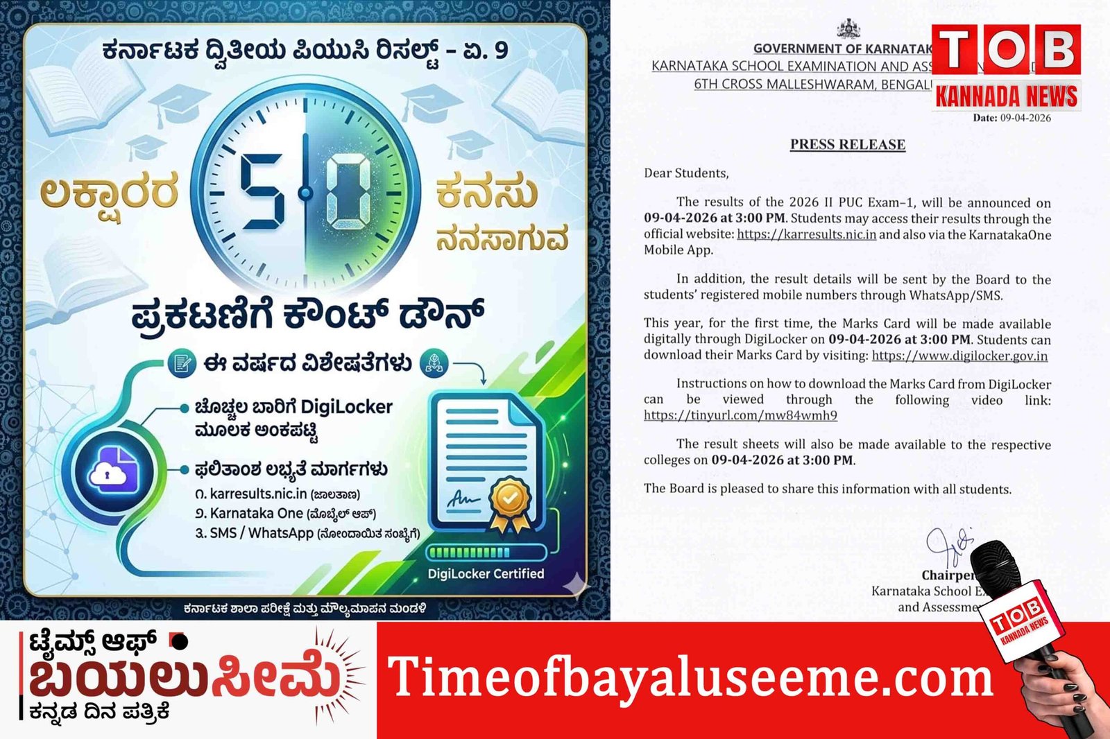 2026ನೇ ಸಾಲಿನ ಕರ್ನಾಟಕ ದ್ವಿತೀಯ ಪಿಯುಸಿ ಪರೀಕ್ಷೆ-1ರ ಫಲಿತಾಂಶವನ್ನು ಏ.9 ರ ಮಧ್ಯಾಹ್ನ 3 ಗಂಟೆಗೆ ಅಧಿಕೃತವಾಗಿ ಪ್ರಕಟಿಸಲಾಗುತ್ತದೆ. ಈ ಕುರಿತು ಕರ್ನಾಟಕ ಶಾಲಾ ಪರೀಕ್ಷೆ ಮತ್ತು ಮೌಲ್ಯಮಾಪನ ಮಂಡಳಿ ಮಹತ್ವದ ಮಾಹಿತಿ ನೀಡಿದೆ.